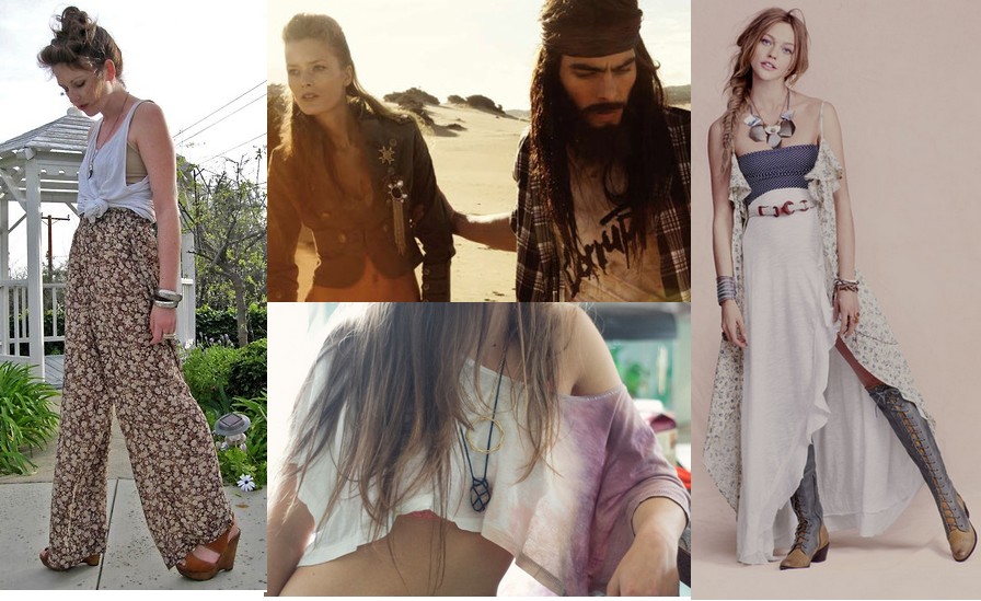 As peças são marcadas pelo Tie Dye, saias longas, franjas de couro, pantalona, calça boca de sino,caftã, macacões.